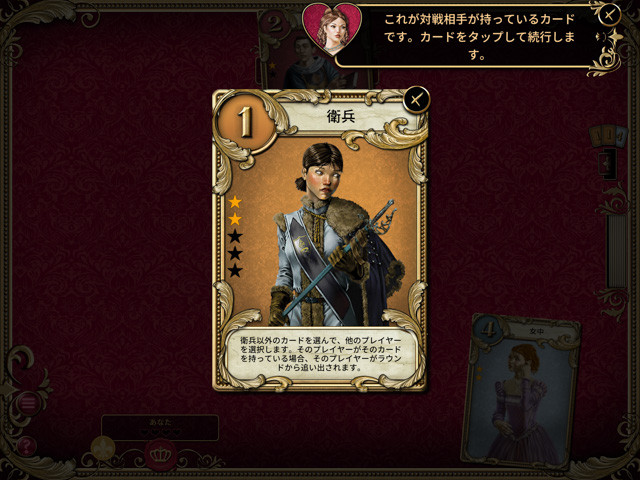 で、これを各プレイヤーが順番に繰り返し、最後の1名になったプレイヤーか、最後のカードが場に出たときに1番点数の高い協力者がラブレターを持っているプレイヤーが姫にラブレターを渡し、思いを遂げて勝者となる。