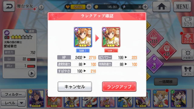 キャラクターレベルアップは比較的簡単に終わるが、ランクはこまめにスタミナを消費して、クエストを何度もプレイすることで上がっていく。