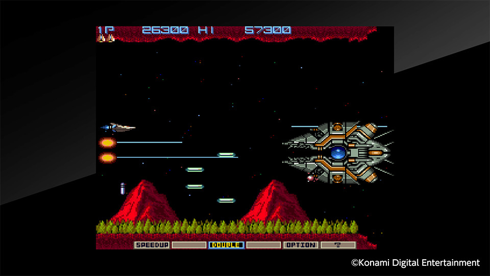 ▲アーケードアーカイブス版グラディウスのビッグコア。外側は無敵だが、中央の青いコアを一気に攻撃すると瞬時に倒せた。