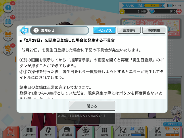 ▲ゲームを開始した瞬間にお知らせで表示される2月29日バグ。