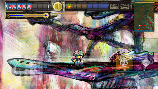 でもって、戦場はやや広いマップを上下左右に移動して戦うものとなっており、操作は左右移動とジャンプ、攻撃ボタン(連続で使用しすぎるとエネルギーが切れる)。