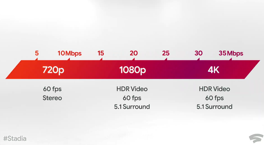 ▲STADIAに必要な通信速度と性能。標準と言える20Mbpsで遊ぶとしても、通信料は膨大になる。普及した場合、Winnyのようにプロバイダ側から制限されることも考えられる。