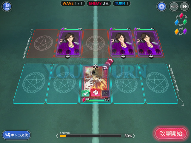 キャラクターはカードとして表現されており、攻撃方向、敵の弱点方向などを考えて配置する必要がある。