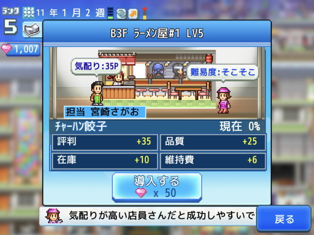 ハートによる強化の成功率には、担当店員の「気配り」が影響するので、主力のフロアには高い人を配置すること。