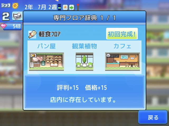 その条件の多くは、新しいお店や施設を設置したり、特定の店舗のレベルを上げたり、店舗の品質や評判を高めるといったもので、それほど意識しなくてもゲームの進行によって自然と増えていきます。