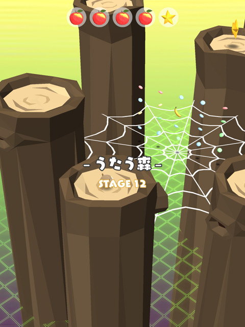 また、1ショットごとにお腹が減り、おなかペコペコになるとゲーム終了になってしまう。だから、ステージ内にあるフルーツをとって食事しながらゴールを目指すゲームになっている。