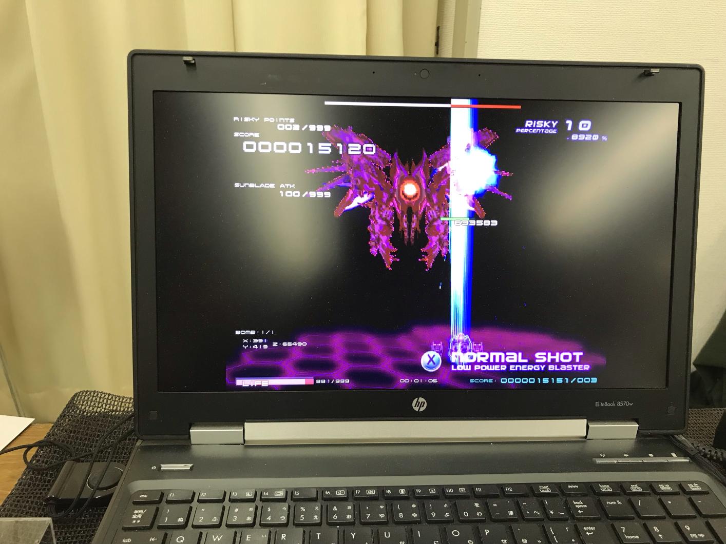 もちろん、「レーザーだけで雑魚もボスも楽に倒せる」なんて都合のいい話はなく、落とし穴もある。レーザーを発射している間は耐久力が高速で減り続けてしまうのだ。レーザーによる耐久力減少は耐久力1になると止まるが、この状態で敵の攻撃を受けたら即死。