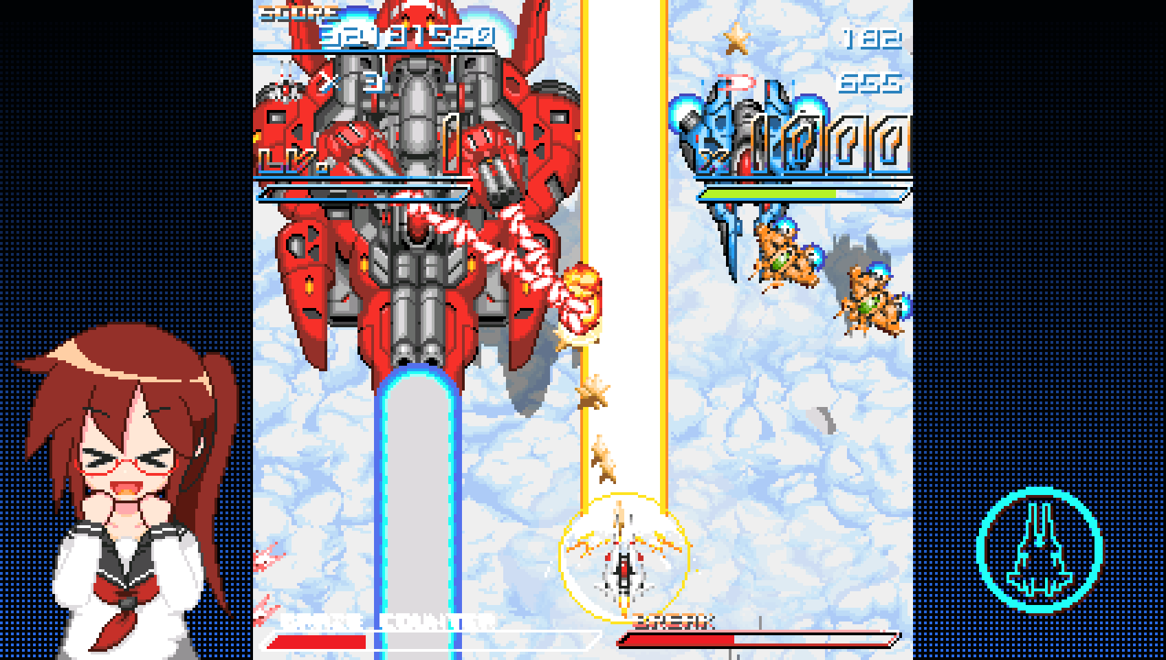 このゲームの自機は高性能で、敵弾を受けても数発耐えられるし、数秒攻撃を受けなければ耐久力が高速に回復していく。
