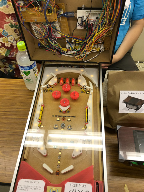 3Dプリンターで部品を構築したピンボール台や、アーケード筐体でゲームを遊べるスペースなど、そこでしか遊べないアトラクション的な出店が5つほど。