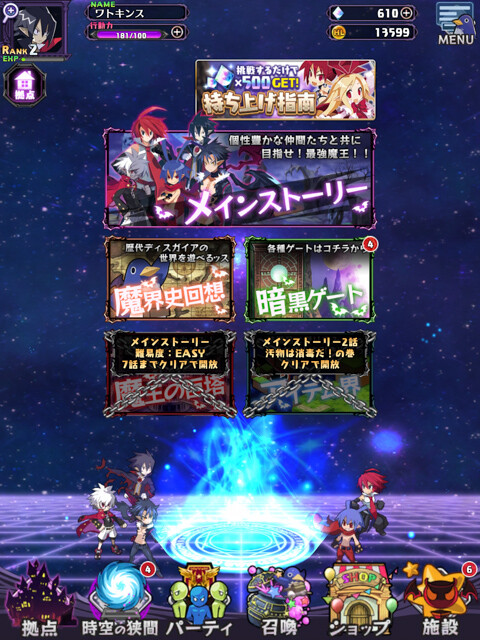 ゲームモードとしては“メインストーリー”、歴代シリーズの物語が回想できる“魔界史回想”、今日かクエストに当たる“暗黒ゲート”と“アイテム界”、タワー系の“魔王の巨塔”の5種。