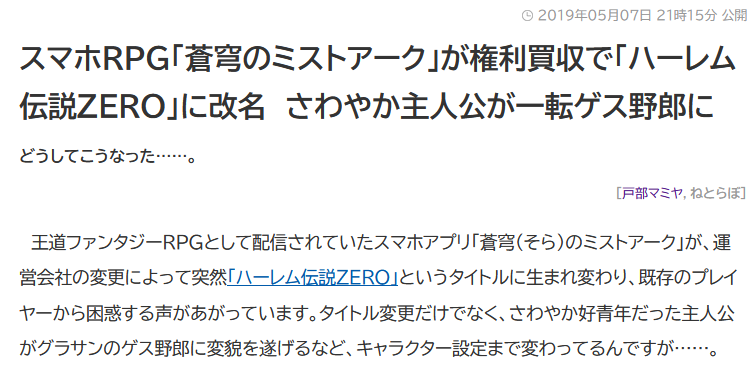 ▲スマホRPG「蒼穹のミストアーク」が権利買収で「ハーレム伝説ZERO」に改名 さわやか主人公が一転ゲス野郎に(ねとらぼ)より。かなり話題になった。