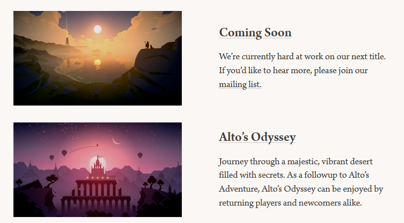 なお、Land & Sea 設立で『Alto's Adventure』が終わるわけではなく、Land & Sea では過去2作をサポートされる。