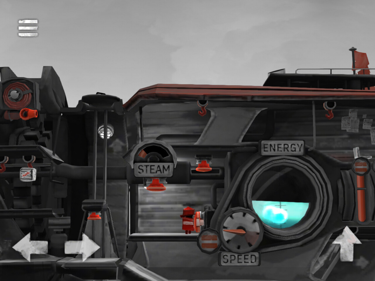 船は複数人数で動かすことを念頭に置いて作られているようで、エンジンは監視していないと止まってしまう。また、定期的に”STEAM”ボタンを押して減圧しないと爆発する。