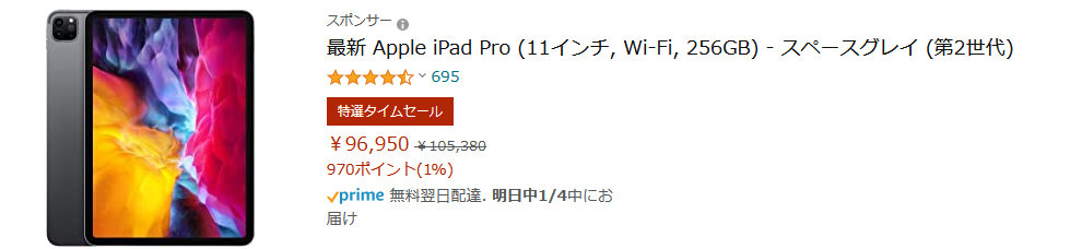 元の価格が高いので 12.9インチの1TBモデルだと14,062円引き、最安の11インチ256GBモデルは96,950円と10万円を切る価格帯になる。