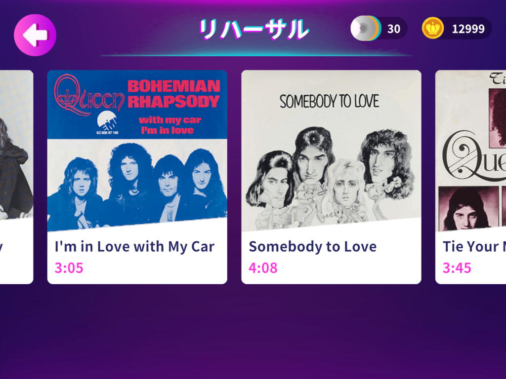 We Will Rock You など有名楽曲ばかりの20曲を収録し、無料でも全曲30秒バージョンを遊べて、300円強支払うだけで全曲フル+特典映像などが楽しめるという価格破壊レベルの安さ。