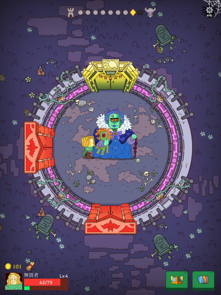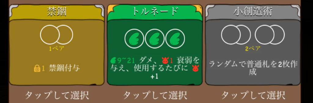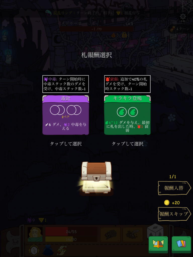 経験値などが手に入り、カードや装備をランダムにドロップするので、そこから選択してキャラクターを強化し、さらにダンジョンの奥へ進める。