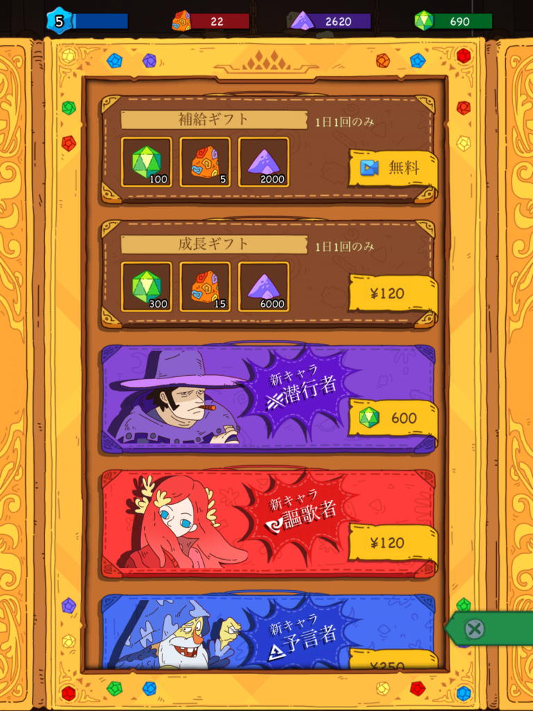 課金:キャラクター購入、緑宝石購入(ゲーム内要素が増える、課金しなくても入手可)、VIP(広告削除など)