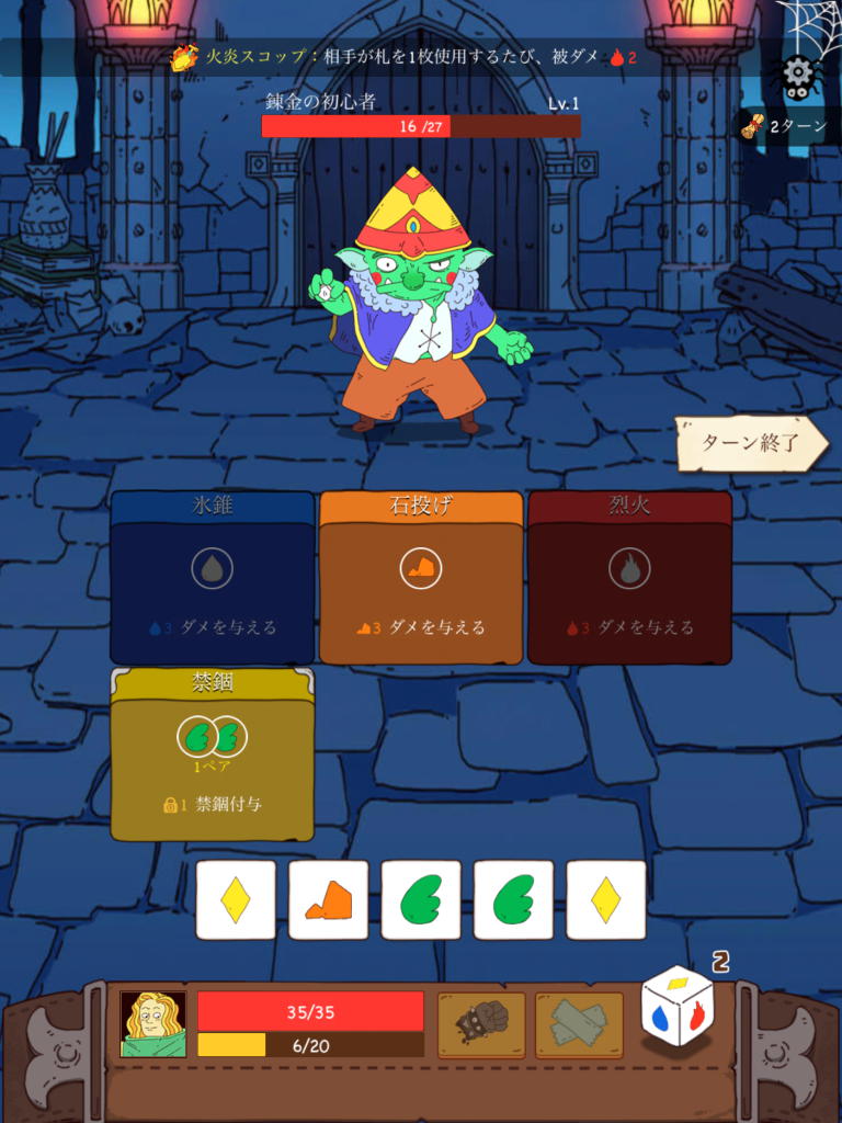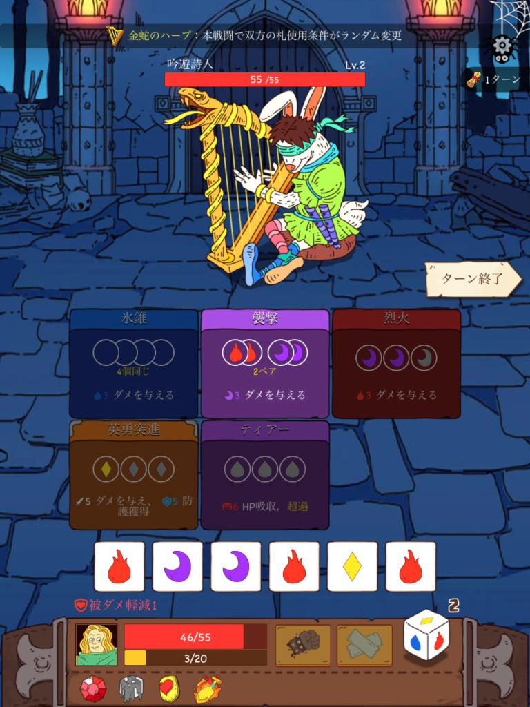 敵も最高6枚までのカードを持っており、プレイヤーと同じようにサイコロを振り、プレイヤーと同じようにスキルを使用してくる。