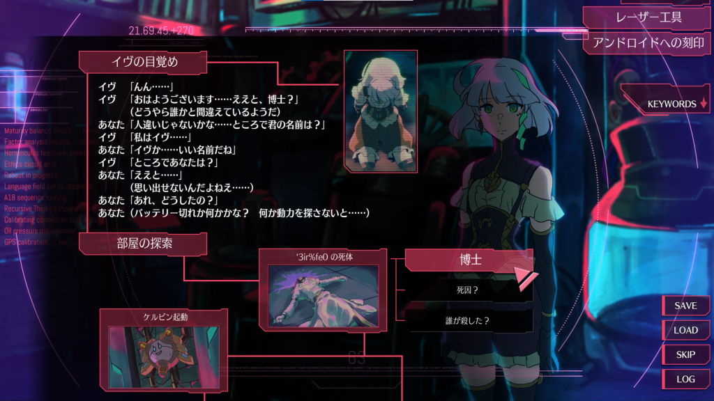 ▲ゲームはプレイヤーの主観視点で描かれる。右側にいるのはヒロインであり容疑者のアンドロイド、イヴ