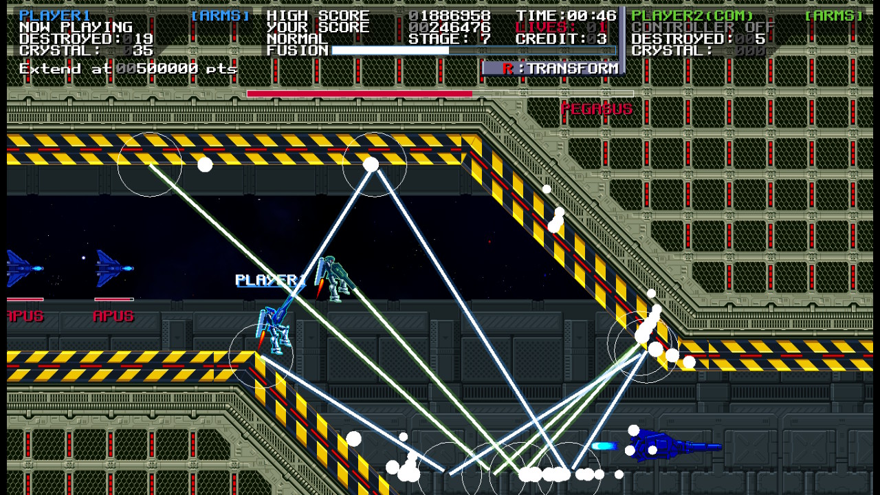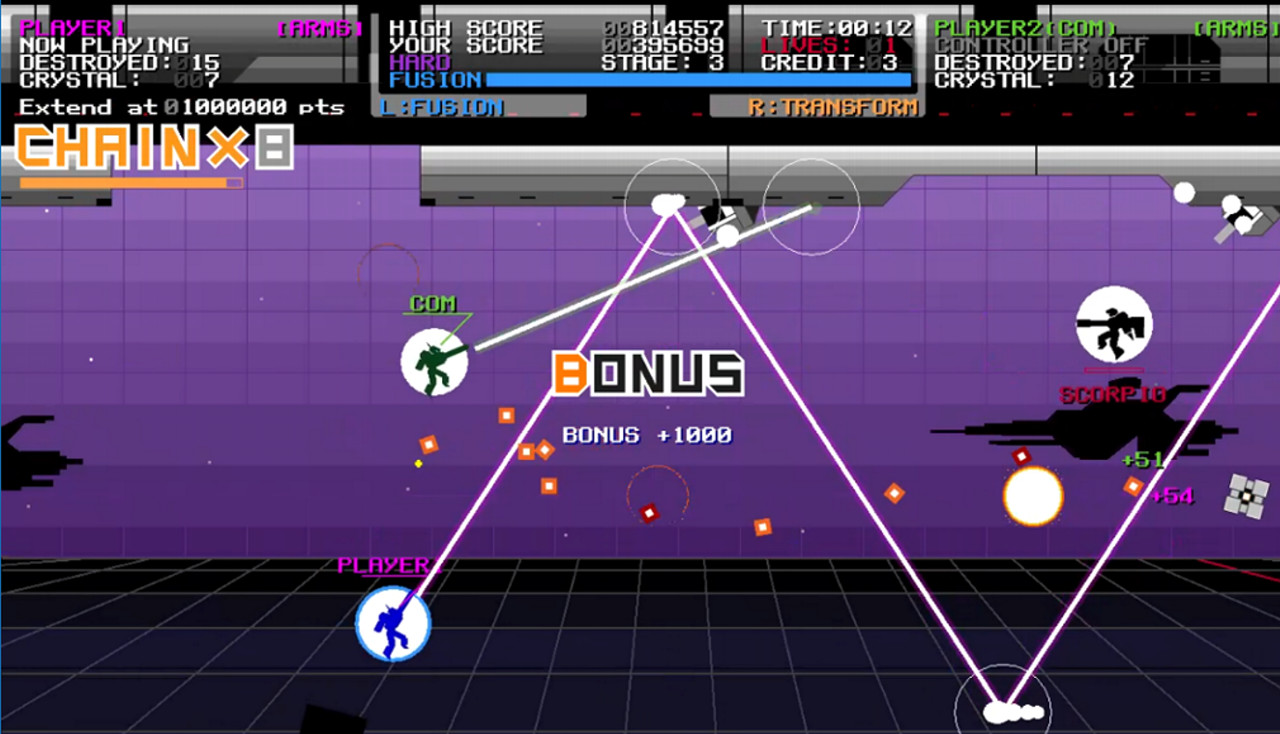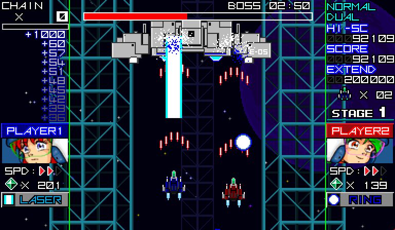 そういったものを遊んでみたかったので、それを独自性として反射レーザーで遊ぶシューティングにしたのが『ジェミニアームズ』です。