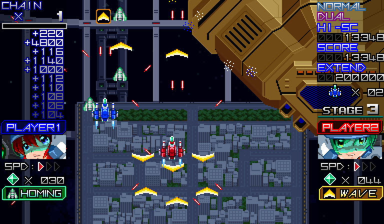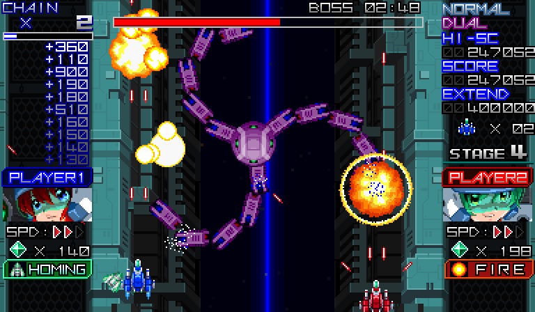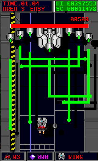 弾幕シューのような当たり判定の小ささ、ステージ構成をコンパクトにしつつ1ステージに2回ボスが出る構成でテンポを作り、ステージ内でも背景の加減速を繰り返して退屈させない。
