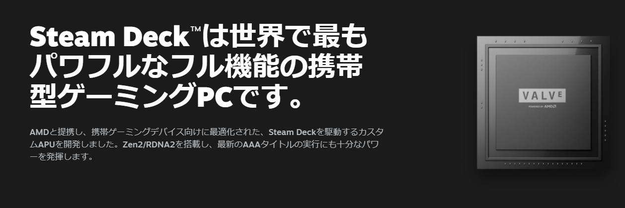 メインとなるチップは AMD と提携して Zen 2 / RDNA 2 世代のカスタム APU を制作しており、Valve は「最新の AAA タイトルの実行にも充分なパワーを発揮します」としている。