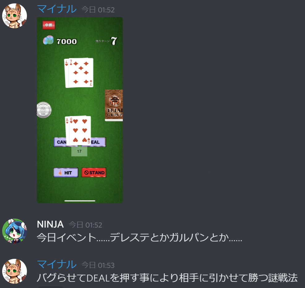 『ブラックジャック』でHITを連打するとカードが出まくるように、手札が良いときにSTANDを連打するだけで勝てる!