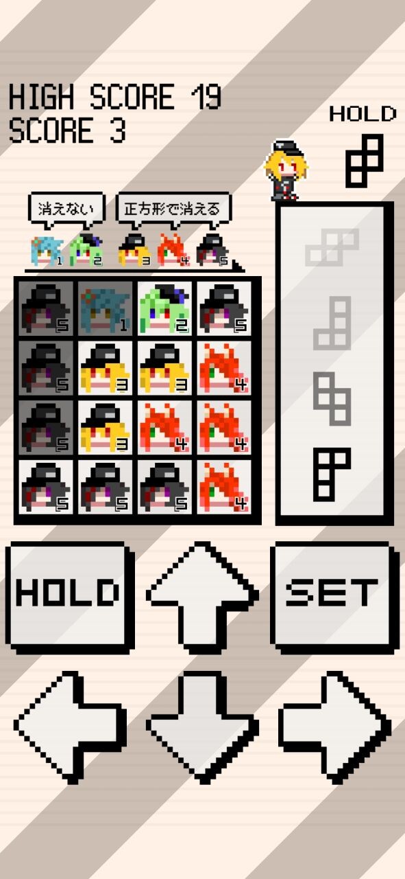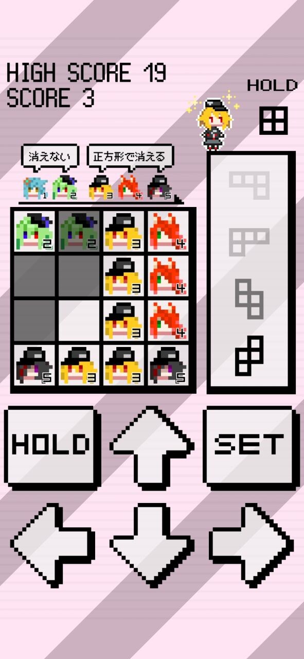 3段階目以降のキャラクターで2×2以上の正方形を作ると、そのキャラクターは消え、スコアが加算される。