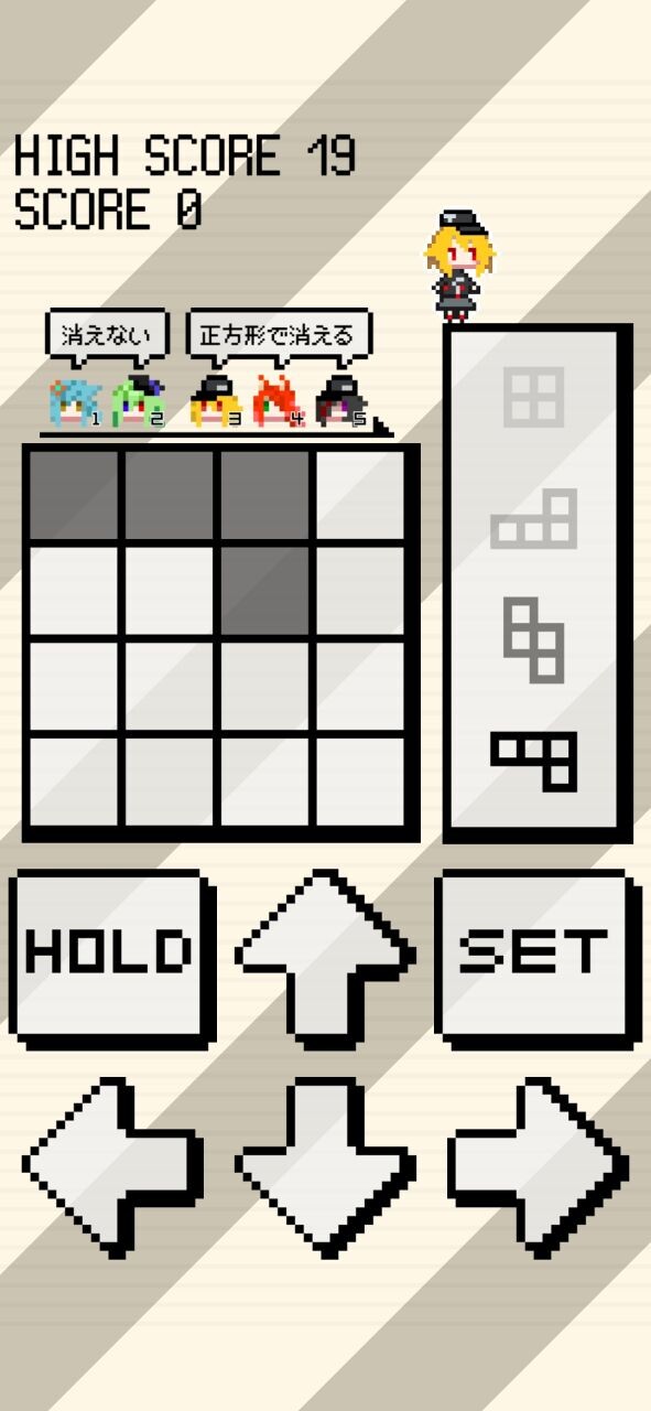 盤面にブロックを配置してキャラを召喚し、正方形に並べて消すパズル。アチーブメント設定が良い感じで埋めたくなる。