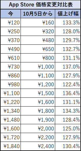 上図は公式に公開された価格表で、これまでならTier1は120円だったが、10月5日以降はTier1が160円、つまり約33%の値上げになる。