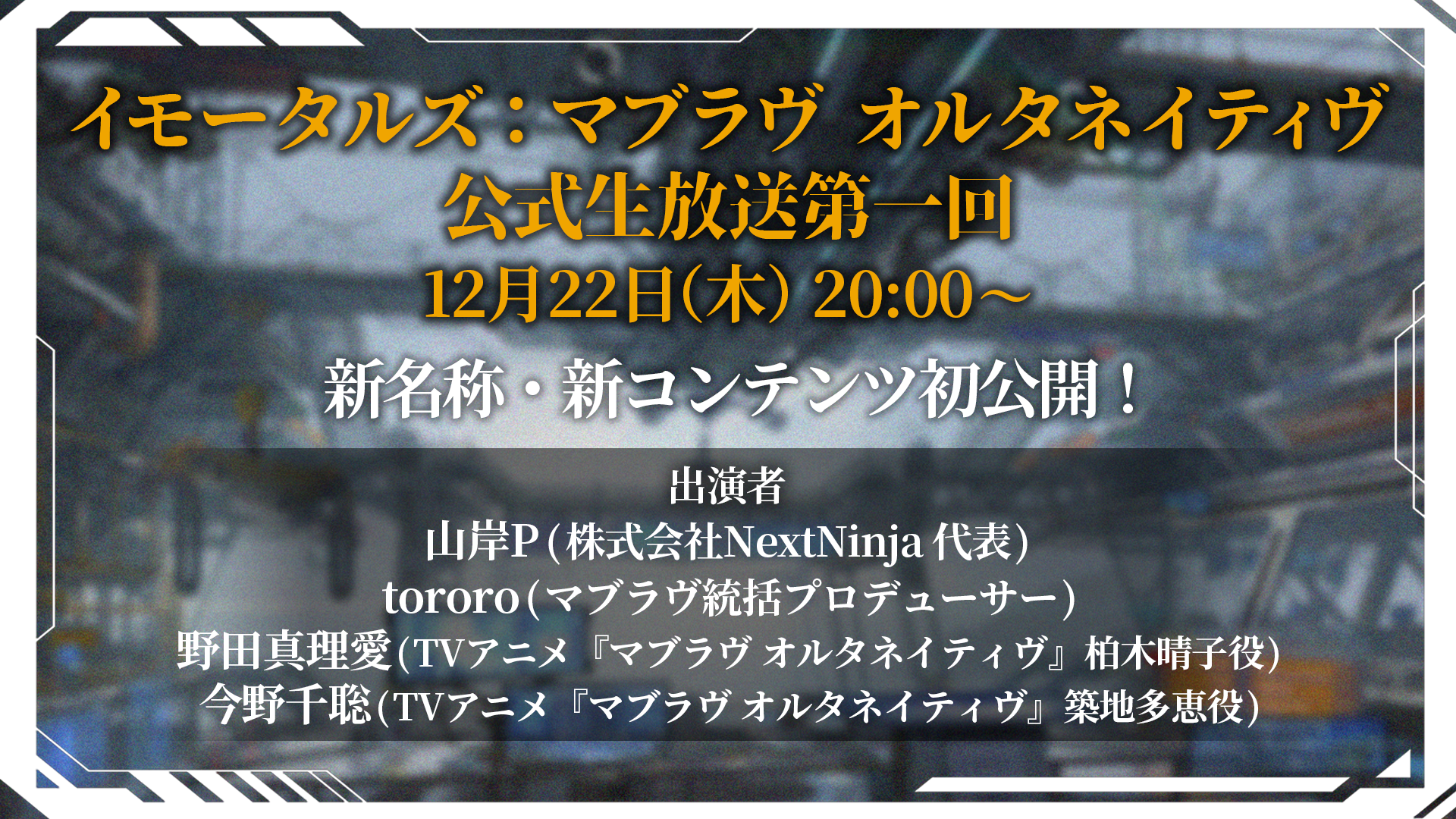NextNinjaと株式会社は、『イモータルズ:マブラヴオルタネイティヴ』再始動後初となる公式生放送第一回を、2022年12月22日20時に行うことを発表した。