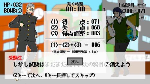 理科・数学・国語・英語・社会の5科目の擬人化少女を相手にして弾幕を避け、撃ち落とすことでスコアに応じて試験の合否が決まるWindows向けのゲームだ。