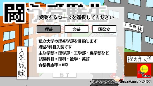 プレイヤーは受験生として理系3科目、文系3科目、国公立5科目のいずれかのテストを受けることになる。