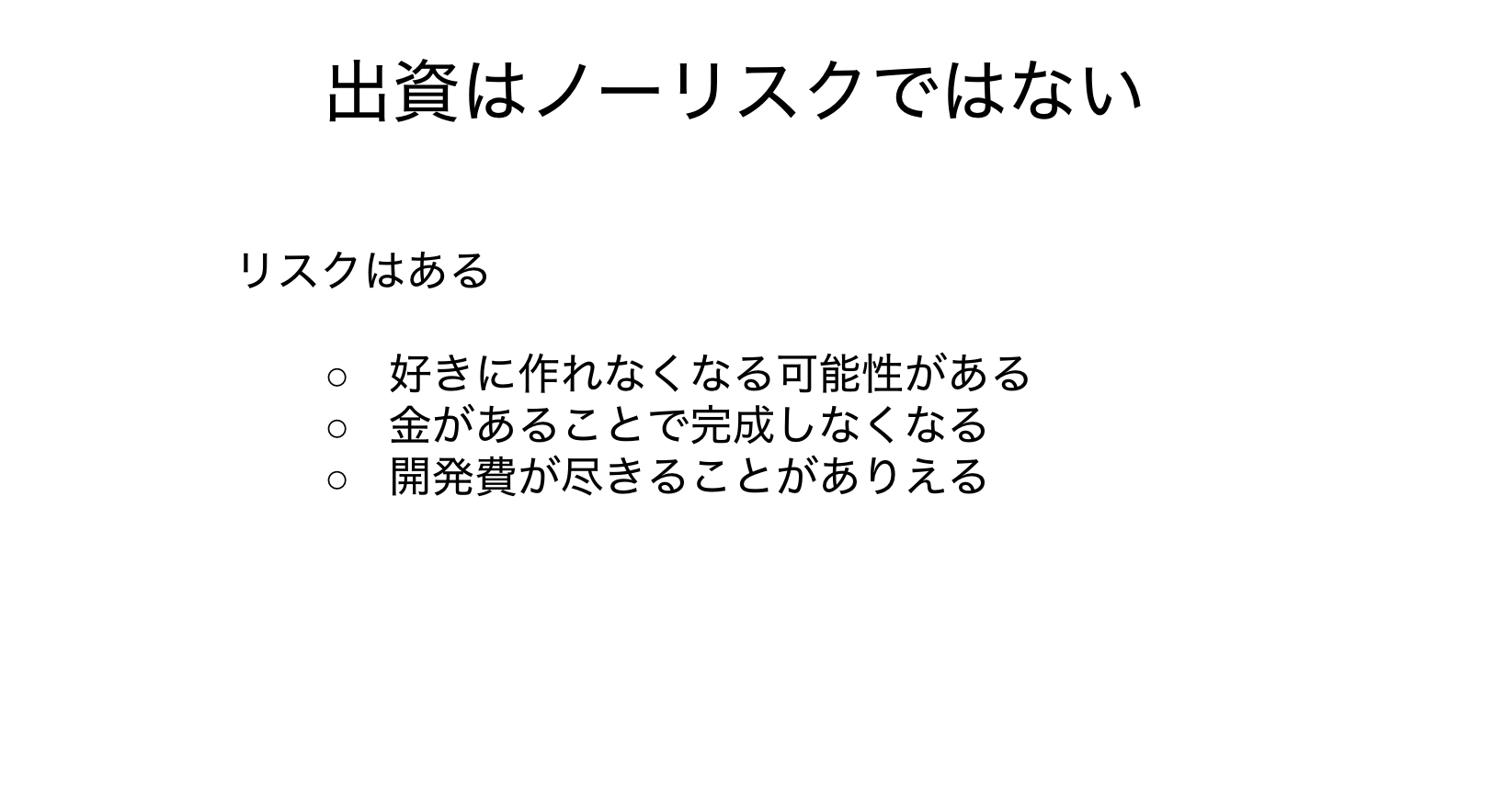 また、出資者も無制限にお金を出せるわけもなく、完成の前に開発費が尽きてしまう場合がありえます。