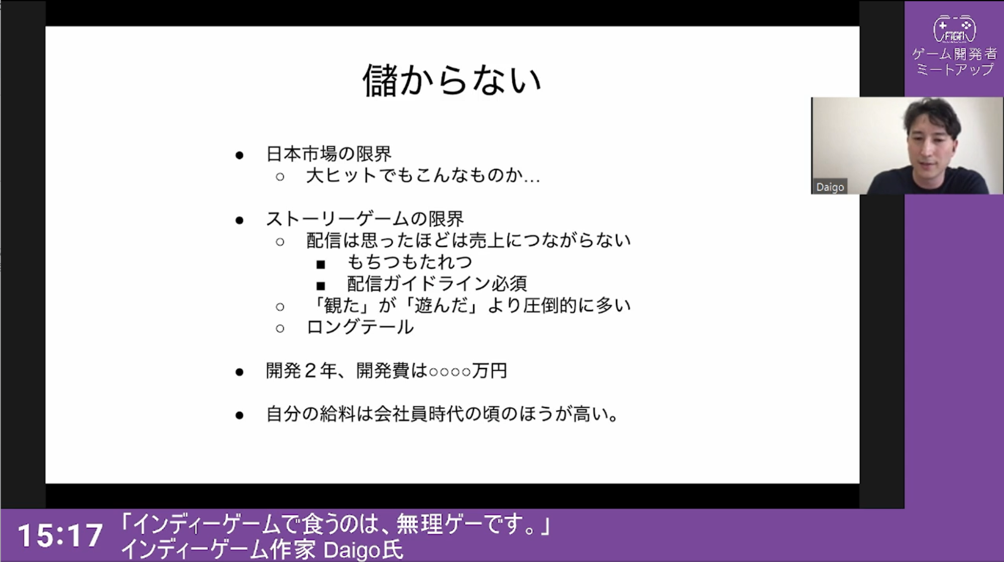 なお、福岡インディーゲーム協会での講演はもともと非常に生々しい数字を伴ったインディー開発者向けの内容だったが、いわゆる「まとめサイト」のようなゴシップサイトによって一部分の切り抜きを悪意の記事タイトルで拡散されてしまったため、本来の内容からはかなりマイルドにして届けしている。