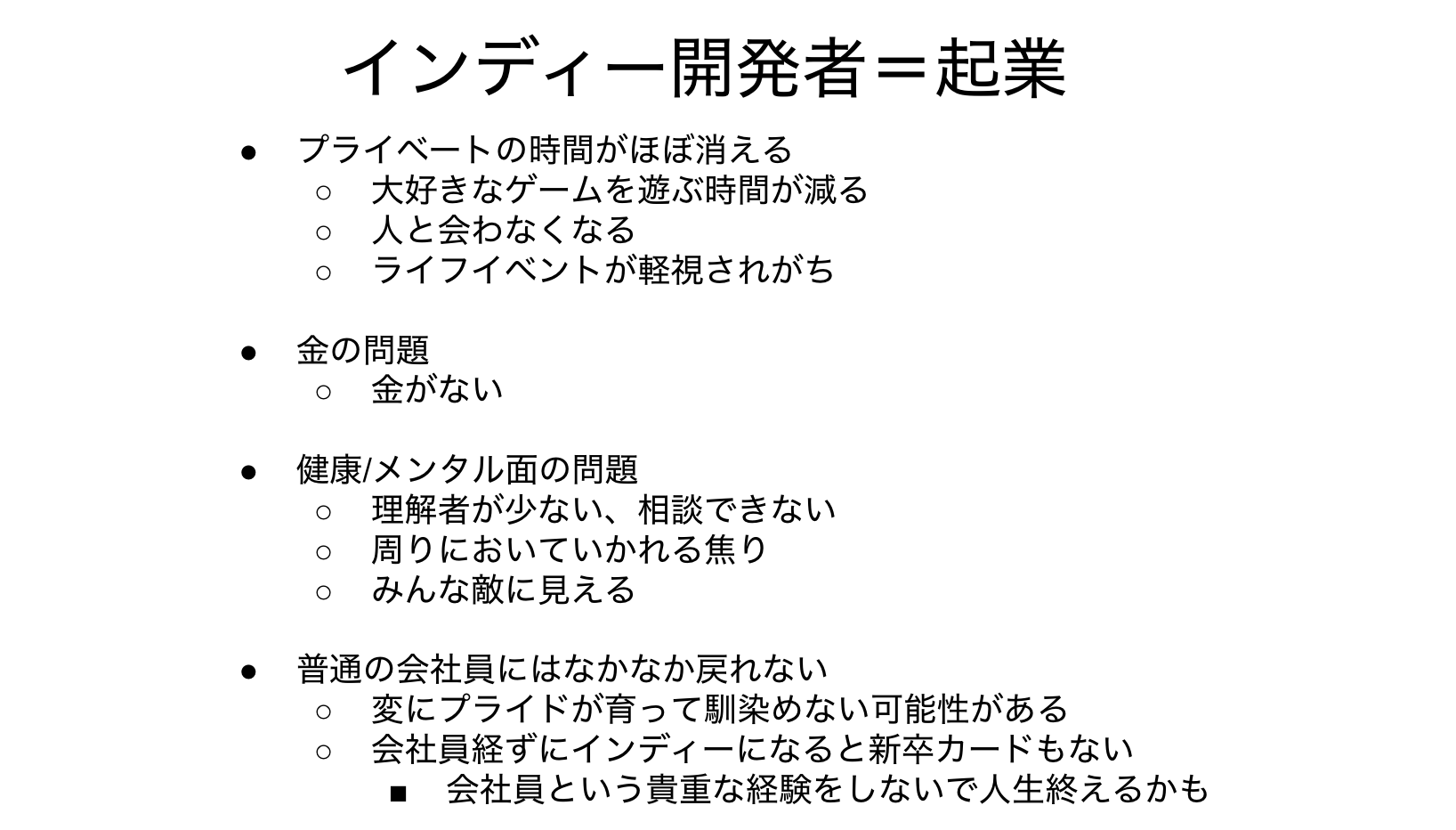 インディー開発者になる方は、自分が起業する覚悟があるのか考えたほうがいいかもしれないですね。まずは会社に勤めながら副業でインディーゲーム作るのがいい気がしますが、一旦は専業インディーになるのがどういうことか、について。